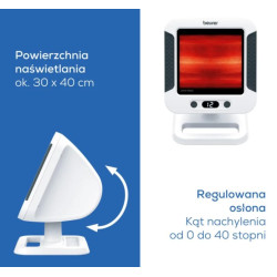 Promiennik podczerwieni firmy Beurer jest idealny na przeziębienia i napięcie mięśni. Posiada bezstopniowo regulowany ekran, timer z automatycznym wyłączaniem i indywidualnie regulowany czas zabiegu. Dzięki osłonie wykonanej z wysokiej jakości ceramiki szklanej, promiennik podczerwieni IL 60 nadaje się również do szczególnie wymagających zastosowań.