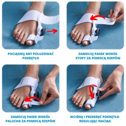 Zakładanie: Włóż stopę w aparat. Zapnij rzepy w kolejności: wokół palucha, wokół śródstopia, a na końcu pasek za piętą.