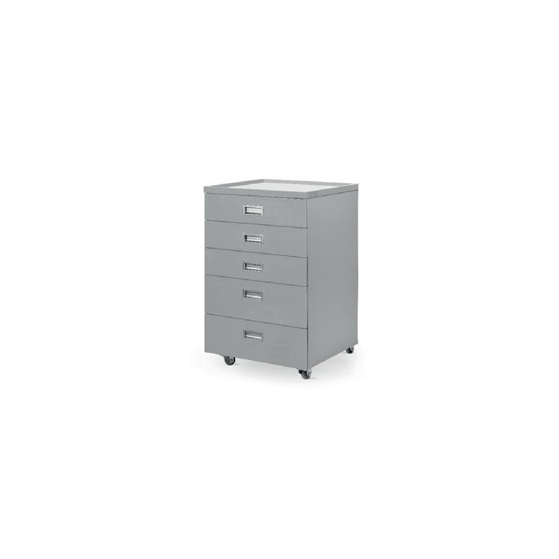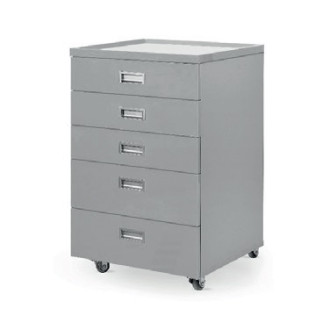 Korpus asystorów, które produkujemy wykonane są płyty laminatowej, fronty z płyty akrylowej. Asystory posiadają szuflady otwierane z systemem samohamującym, uchwyty szuflad nie wystające poza obrys szafki. Szklany blat z ogranicznikami zapobiegającymi zsuwanie się przedmiotów. Asystory trzy i cztero-szufladowe wyposażone w chromowaną kolumnę gazową na chromowanej podstawie z systemem jezdnym do łatwego przemieszczania. Asystor pięcioszufladowy wyposażony w koła do łatwego przemieszczania.