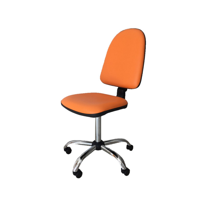 Fotel lekarski przybiurkowy oparty na stabilnej, pięcioramiennej podstawie ze stali chromowanej wyposażonej w kółka. Wyposażony jest w oparcie pleców i obrotowe siedzisko z regulacją wysokości przy pomocy sprężyny gazowej dźwignią pod siedziskiem. Oparcie i siedzisko fotela wypełnione jest pianką PU i obszyte atestowanym materiałem tapicerskim w kolorze do wyboru z palety producenta. Fotel posiada w podstawie 5 kółek kierunkowych (skrętne) o średnicy 50 mm.