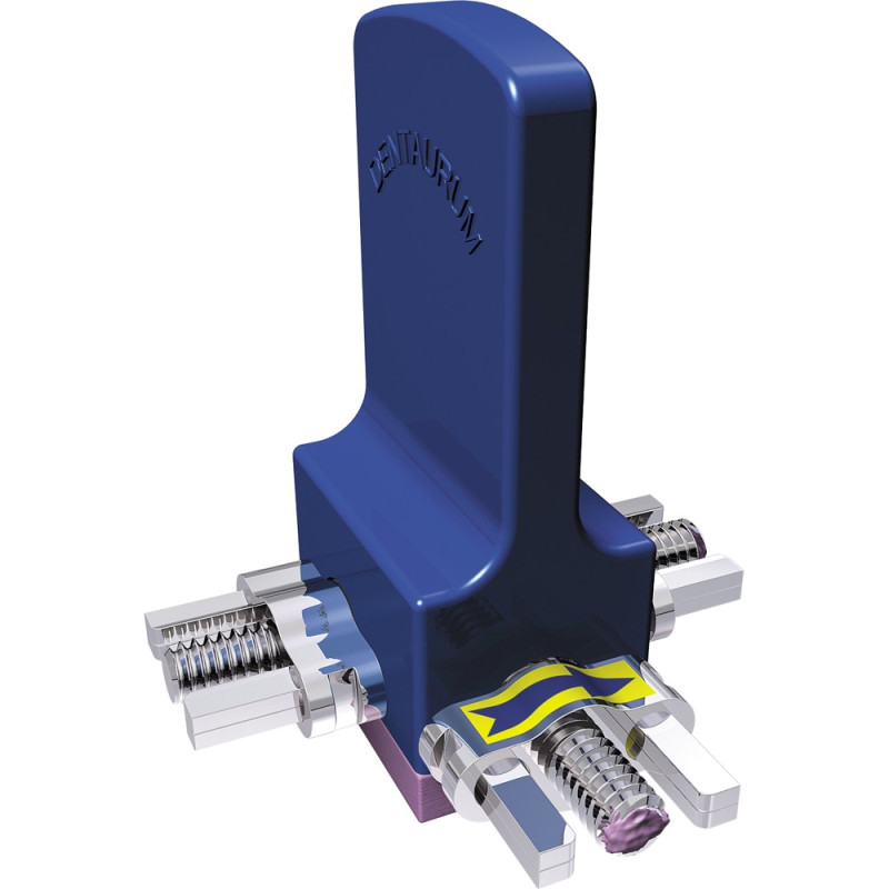Śruba poprzeczno-protruzyjna do płytek rozcinanych w kształcie litery Y. Wzmocnione prowadnice.
