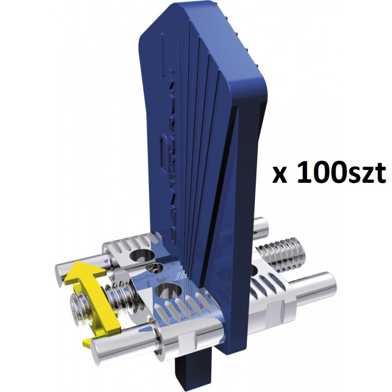 Bardzo gruba śruba o większym trzonie. Z prowadnicą. Do przesuwania zębów w poprzek łuku zębowego w szczęce i dwu-szczękowych aparatów ortodontycznych. Jaskrawożółta strzałka z tworzywa sztucznego. Trzon śruby z poprzecznymi nacięciami, które zapewniają optymalną retencje w tworzywie. Ograniczenie po uzyskaniu maksymalnego przesuwu .