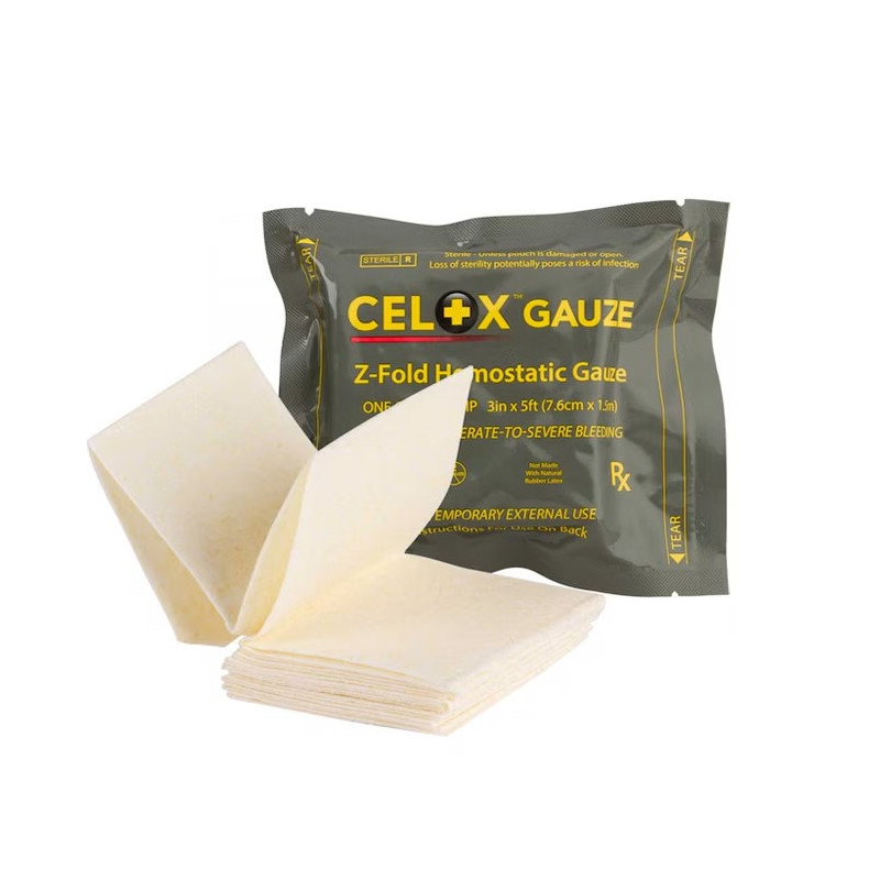 Gaza hemostatyczna składana w "Z" powleczona preparatem hemostatycznym Celox, umożliwia łatwe i precyzyjne wykonanie opatrunku. Zastosowany układ materiału nośnego pozwala na zmniejszenie objętości opatrunku przy zachowaniu skuteczności tamowania krwotoków. Krótsza gaza składana warstwowo ułatwia stosowanie i skraca czas aplikacji. Łatwe do przechowywania opakowanie w kolorze maskującym zawiera jeden pasek gazy o długości 150 cm złożonej warstwowo.