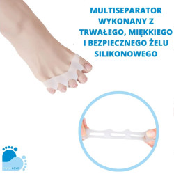 Jest to niezastąpione wsparcie w profilaktyce palucha koślawego (haluksa) oraz deformacji takich jak palce młoteczkowate i szponiaste. Multiseparator działa relaksująco, redukując napięcie i ból powstały na skutek noszenia niewygodnego obuwia.