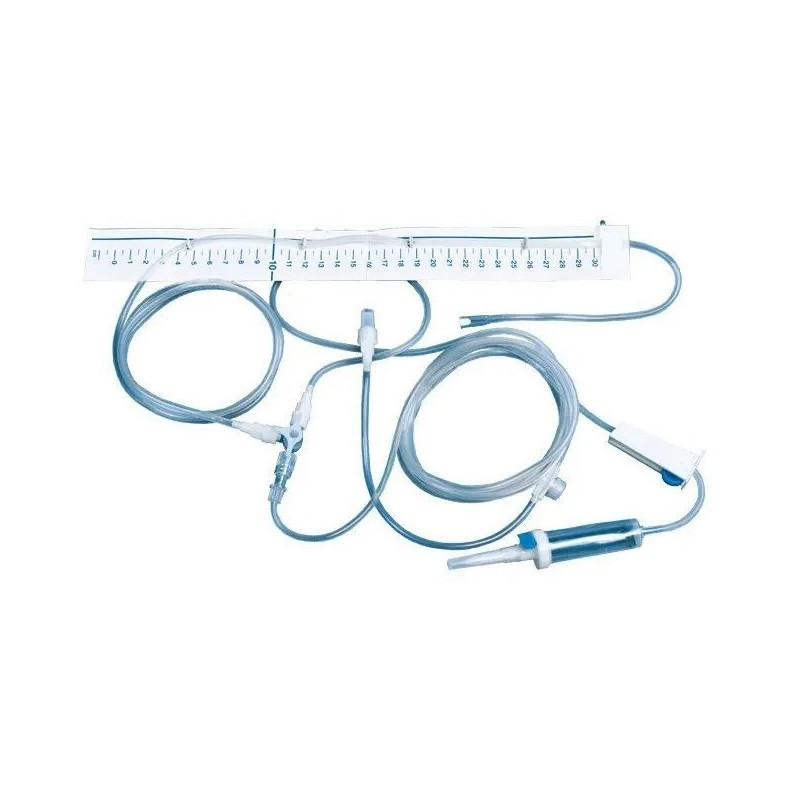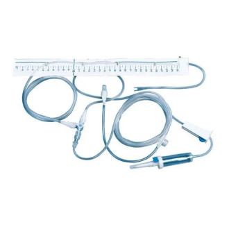 Przyrząd do przetoczeń płynów infuzyjnych z możliwością pomiaru ośrodkowego ciśnienia żylnego (OCŻ) ciśnienia krwi panującego w dużych naczyniach żylnych (żyła główna dolna, żyła główna górna) przy ujściu do prawego przedsionka serca i przeciwbakteryjnym filtrem powietrza.