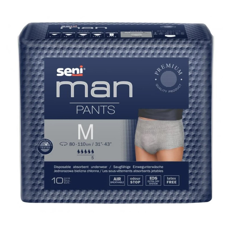 Seni Man Pants to majtki chłonne dla mężczyzn z nietrzymaniem moczu. Wyglądają jak zwykła bielizna, zapewniają maksymalne poczucie suchości i komfortu.