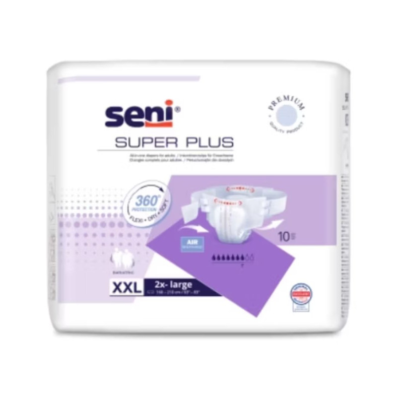 Super Seni Plus to oddychające pieluchomajtki dla dorosłych, zapinane na rzepy, przeznaczone dla osób z problemem nietrzymania moczu. Stanowią drugi z czterech poziomów chłonności (chłonność dzienna) i są rekomendowane przy nasilonym nietrzymaniu moczu oraz inkontynencji kałowej.