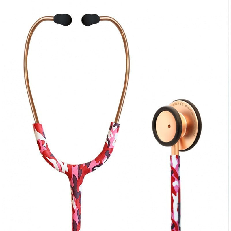 Rose Gold Satin Camouflage to stetoskop internistyczny, który posiada głowicę podwójną z tzw. „pływającą” membraną. Daje to pełną możliwość osłuchiwania zarówno tonów wysokich jak i niskich, bez potrzeby przestawiania głowicy z membrany na lejek. Wystarczy zaledwie delikatny nacisk, aby słyszalne były dźwięki o niskiej częstotliwości. Przy zwiększonym nacisku słyszalne są dźwięki o częstotliwości wysokiej.