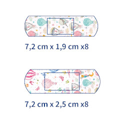 Plastry z nieprzywierającym wkładem chłonnym, z kolorowym nadrukiem, przyjazne dla skór podatnych na uczulenia.
