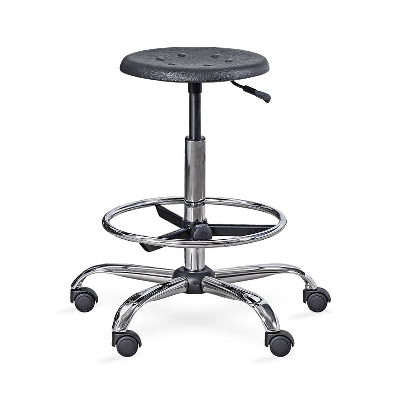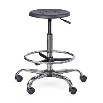 Taboret na podstawie stalowej, chromowanej, na kółkach. Siedzisko okrągłe, tworzywowe, twarde, pozwala na łatwe utrzymanie czystości. Dzięki zastosowanej sprężynie gazowej możliwość dostosowania wysokości taboretu do potrzeb użytkownika. Dodatkowo, podnóżek z regulacją wysokości mocowania.