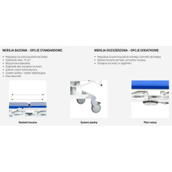 Stół zabiegowy STEL22 oferuje możliwość dostosowania do indywidualnych potrzeb placówki poprzez wybór między systemem jezdnym a stabilizującymi stopkami. Ta opcja umożliwia placówkom medycznym personalizację stołu w zależności od preferencji dotyczących mobilności lub stabilności. Wybór systemu jezdnego jest idealny dla środowisk, gdzie konieczne jest częste przemieszczanie stołu między pomieszczeniami, zapewniając łatwość transportu. Z kolei stabilizujące stopki są doskonałym rozwiązaniem dla miejsc, gdzie priorytetem jest maksymalna stabilność stołu podczas wykonywania precyzyjnych procedur medycznych.