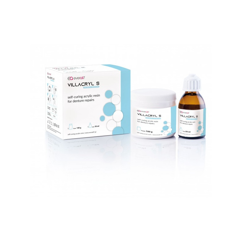 Samopolimer jako tworzywo akrylowe przeznaczone do reperacji protez zębowych. Zestaw płyn plus proszek w kombinacji 2 kolorów: 0- bezbarwny, V4-różowy z żyłkami.