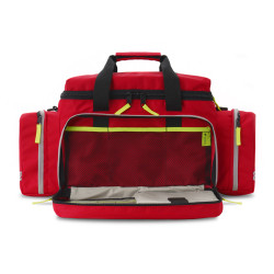 W przedniej kieszeni torby znajdują się ampularium na 30 ampułek, kieszeń wykonana z przezroczystej folii z uchwytami z gumy oraz trzy otwarte kieszenie z siatki.