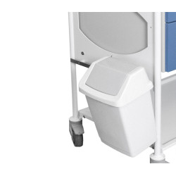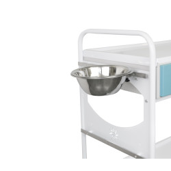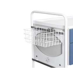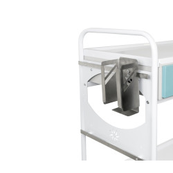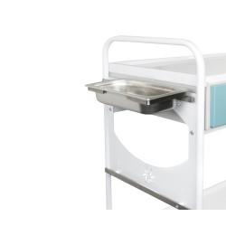 Tace wózka wykonane są ze stali pokrytej farbą proszkową odporną na zarysowania. Wózek osadzony jest na stalowej podstawie wyposażanej w kółka jezdne z hamulcem. System szynowy znajdujący się po jednej ze stron wózka umożliwia zamontowanie dodatkowego wyposażenia na jednej z dwóch szyn.