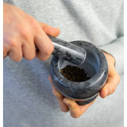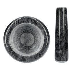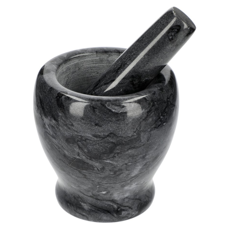 Marzysz o własnych aromatycznych mieszankach ziół i przypraw? Ten elegancki marmurowy moździerz z tłuczkiem świetnie Ci w tym pomoże. Wykonany jest ze szlachetnego i trwałego kamienia - czarnego, cieniowanego marmuru o niepowtarzalnej fakturze. Chropowate wnętrze moździerza i końcówki tłuczka oraz odpowiednia głębokość czynią go narzędziem idealnym do rozdrabniania ziół i przypraw, a także orzechów oraz leków. Będzie Ci z powodzeniem służyć przez długie lata.