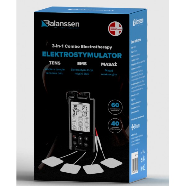 Elektrostymulator mięśni Balanssen to nowoczesne urządzenie, które posiada 3 funkcje: TENS, EMS i MASAŻ oraz aż 40 poziomów intensywności – do wyboru. TENS, czyli przezskórna elektryczna stymulacja nerwów, to metoda niefarmakologicznego i nieinwazyjnego, a przez to pozbawionego wielu skutków ubocznych, leczenia dolegliwości bólowych. TENS znajduje zastosowanie w wielu stanach chorobowych, pourazowych i dysfunkcjach, którym towarzyszy ból. Wspomaga proces rehabilitacji i modelowania sylwetki, a dodatkowo łagodzi ból mięśni i stawów. Idealny do pracy z pacjentami w gabinecie. Ze względu na skuteczne działanie, w swoich gabinetach wykorzystują go fizjoterapeuci i specjaliści, którzy na co dzień pracują z różnymi dolegliwościami pacjentów oraz przeprowadzają rehabilitacje. Produkt ten, powinien znajdować się także na siłowniach, salach fitness i w domach, gdzie bez względu na czas można zapewnić sobie regenerujący masaż.
