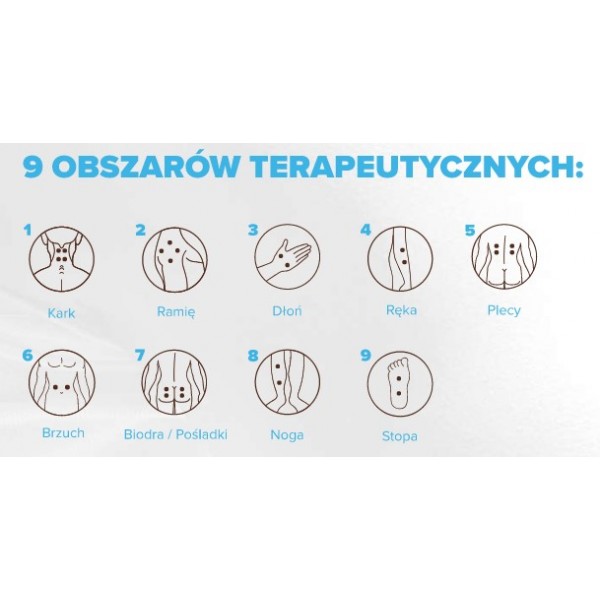 9 obszarów terapeutycznych: kark, ramię, dłoń, ręka, plecy, brzuch, biodro/pośladki, noga, stopa