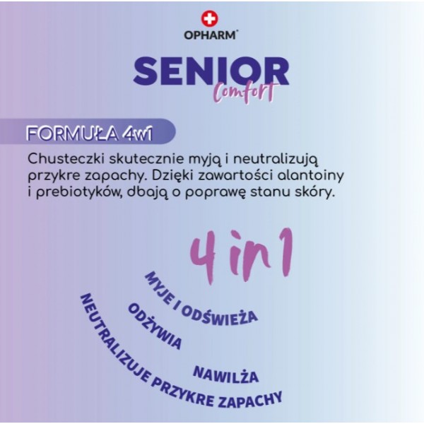 Chusteczki nawilżane Senior Comfort Opharm® to niezwykle praktyczne rozwiązanie do codziennej pielęgnacji osób starszych, obłożnie chorych i niepełnosprawnych. Pozwalają w szybki i wygodny sposób oczyścić twarz, dłonie i całe ciało bez konieczności stosowania wody. Chusteczki zawierają specjalną substancję pochłaniającą brzydkie zapachy.