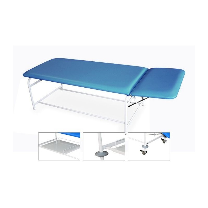Stalowa konstrukcja kozetki pokryta jest powłoką wykonaną w technologii proszkowej co zapewnia odporność na uszkodzenia mechaniczne, na korozję i nadaje estetyczny wygląd. Leże i wezgłowie jest wykonane z wytrzymałej płyty pokrytej tapicerką z pianki poliuretanowj, obitej odpornym tworzywem skóropodobnym lub winylowym umożliwiającym łatwe utrzymanie czystości, w szerokiej gamie kolorystycznej. Wezgłowie z regulowanym kątem pochylenia.