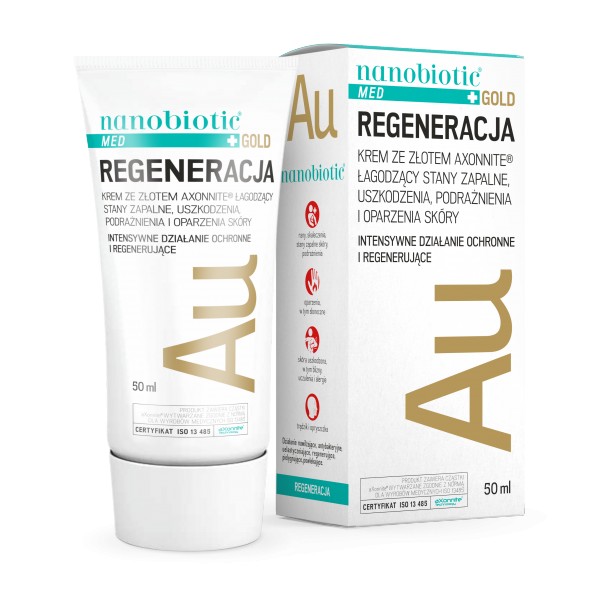 Wyrób medyczny, krem ze złotem aXonnite i fomblinem łagodzący podrażnienia i oparzenia skóry zapewniający regenerację i ochronę antybakteryjną. Krem Nanobiotic Med Gold Regeneracja dedykowany jest szczególnie do wsparcia kuracji skóry poparzonej, uszkodzonej, podrażnionej częstym dezynfekowaniem, z odleżynami oraz ze stanami zapalnymi.