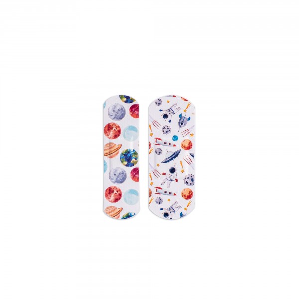 Plastry z nieprzywierającym wkładem chłonnym, z kolorowym nadrukiem, przyjazne dla skór podatnych na uczulenia.