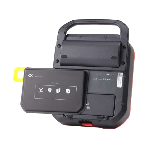 AED zawiera wczepiany zestaw pierwszej pomocy z rękawiczkami, maszynką, maseczką i nożyczkami – zawsze pod ręką, bez potrzeby szukania akcesoriów.