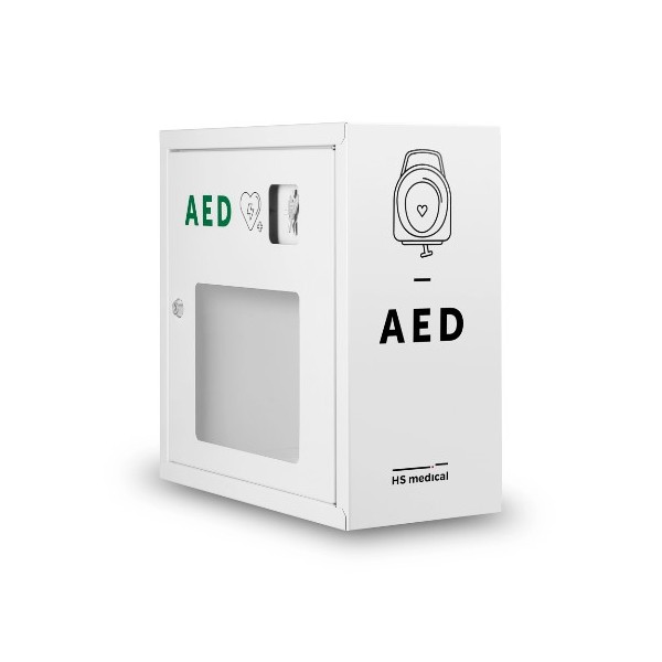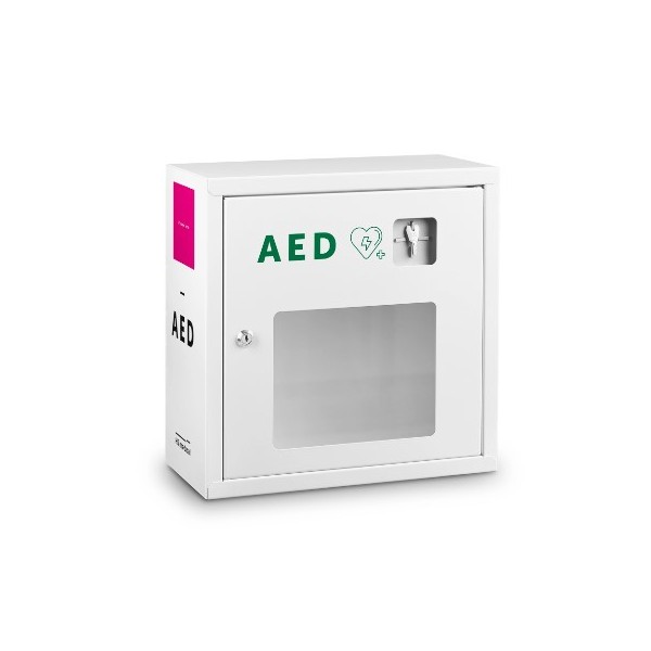 Szafka wykonana jest z wysokiej jakości, solidnej blachy, która skutecznie chroni defibrylator przed uszkodzeniami mechanicznymi oraz dostępem osób nieupoważnionych. Przezroczysta szybka umożliwia łatwą obserwację kontrolki AED, co pozwala na bieżąco monitorować stan urządzenia. Kontrastowe napisy oraz wyraźne oznaczenie „AED” ułatwiają szybkie zidentyfikowanie zawartości szafki, nawet w nagłych sytuacjach.