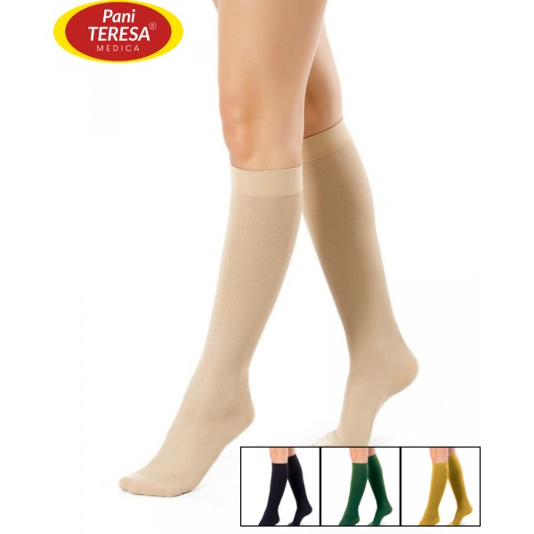 Profesjonalna linia profilaktycznych skarpet podróżnych PANI TERESA® TRAVEL, stymulując krążenie krwi, zapewnia uczucie komfortu i ulgi dla zmęczonych nóg. Skarpety wykorzystują zmienny, stopniowany ucisk na poziomie 1 klasy kompresji (15-21 mmHg), najsilniejszy w kostce i stopniowo słabnący w kierunku kolana, aby przynieść ulgę nawet najbardziej zmęczonym nogom. Jeżeli spędzasz dużo czasu w samochodzie, w samolocie, w biurze, w pozycji siedzącej lub stojącej i odczuwasz dolegliwości związane z obrzękami i bólem nóg, linia PANI TERESA® TRAVEL jest właśnie dla Ciebie!